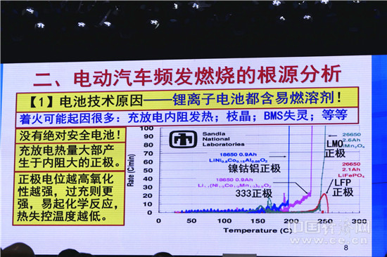接下来,杨裕生院士就从多个角度分析了电动汽车频频起火的原因。从技术层面来看,目前电动汽车最广泛采用的锂电子电池中都含有易燃溶剂,因此起火概率更高。