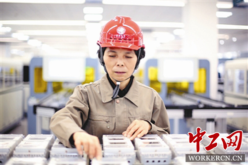 黄金娟在智能电能表自动化检定流水线上。 张岩 摄