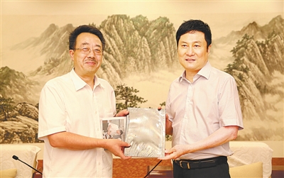 苏权科(左)向郭大为赠书 本报记者 鲜康 摄