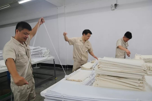 浙江省总工会干部林强(左)、刘朝晖(中)、姚晓龙(右)在车间安装窗帘。
