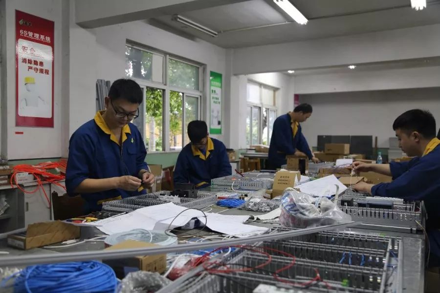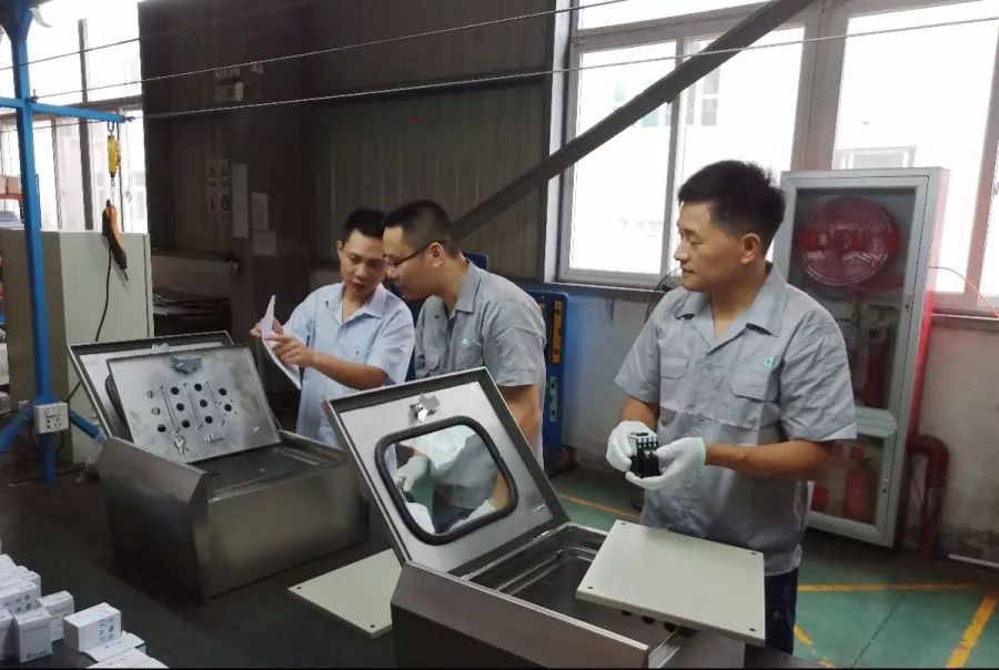 省总工会干部徐立(中)、王峰(右)在车间组装电箱。