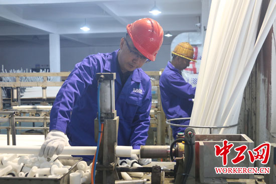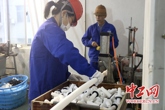 丽水市总工会组宣女工部副部长陈亮和市总工会经保法工部科员梁梦茜在完成这条小流水线上的最后一步,将装好橡胶圈的过滤口装在过滤管上。中工网记者姚怡梦摄