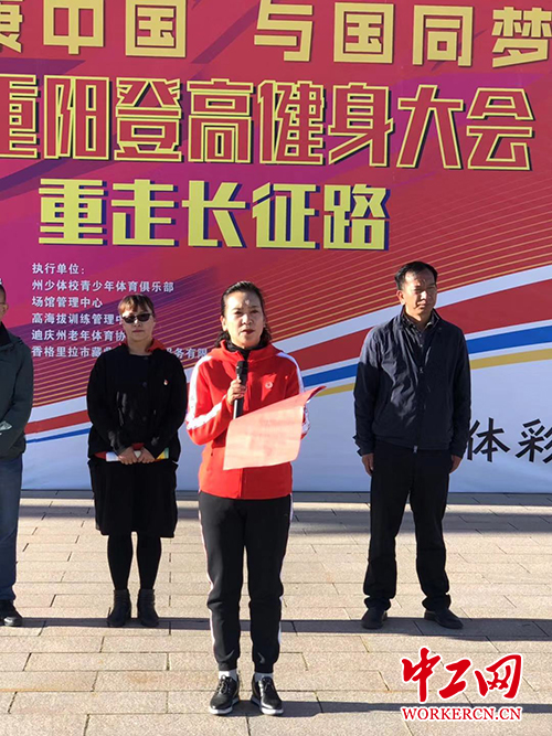 州政协副主席、州总工会主席杨凤喜出席活动并致辞。她指出,九九重阳、登高望远、感恩思源,是中华民族的优良传统。本次活动将重走长征路活动与重阳登高健身大会结合起来,目的就是纪念红军长征胜利83周年,弘扬“长征精神”和“勇攀高峰”的体育精神,进一步深入开展好“不忘初心、牢记使命”主题教育活动营造良好的氛围,她希望,迪庆人民能够以更加饱满的精神状态、更加强健的体魄,投身到各项事业建设中,她要求,广大党员要坚守“为人民谋幸福,为民族谋复兴”的初心和使命,为实现中国梦的迪庆篇章而努力奋斗。