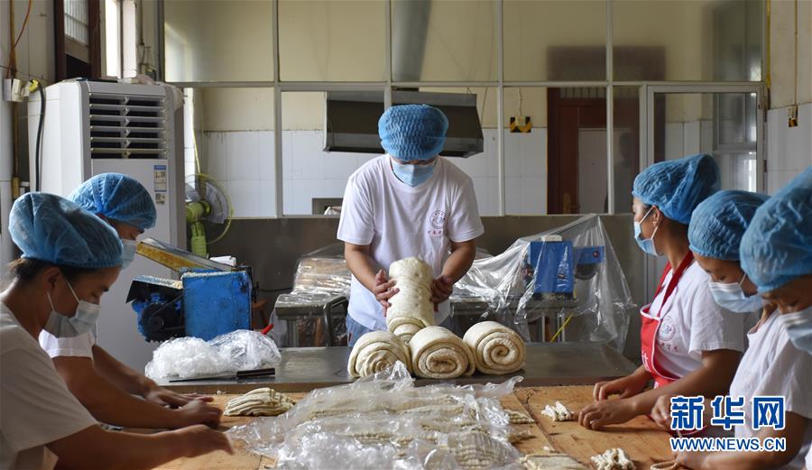 7月8日,张亚钊(中)在车间加工面团。 新华社记者 韩朝阳 摄
