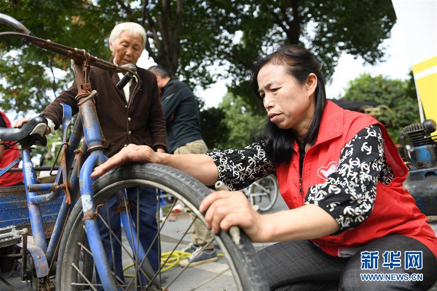 10月14日,在社区的志愿服务日上,朱水银为市民修车。新华社记者 翁忻旸 摄