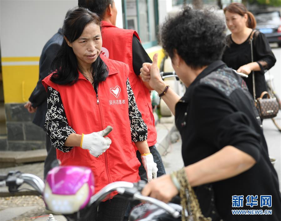 10月14日,在社区的志愿服务日上,前来修车的市民向朱水银竖起大拇指点赞。新华社记者 翁忻旸 摄