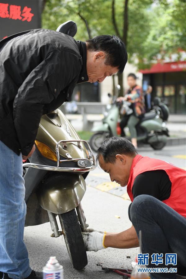 10月14日,在社区的志愿服务日上,施献荣(右)为市民修车。新华社记者 翁忻旸 摄