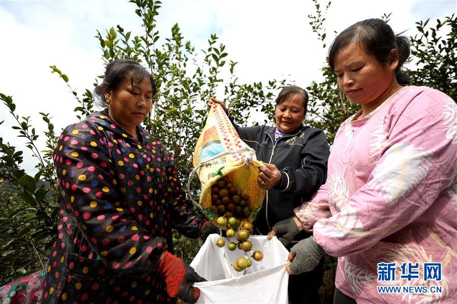 10月27日,在广西三江侗族自治县斗江镇宇塘油茶基地,茶农将采摘的油茶果装袋。 近日,在广西三江侗族自治县的油茶种植基地,茶农忙着采摘油茶果,山间一派丰收景象。近年来,三江县把发展油茶产业作为推进脱贫攻坚的支柱,注重采取“企业+基地+农户”的形式,打造油茶基地,带动村民增收致富。目前,当地油茶种植面积达60多万亩。 新华社发(梁克川 摄)