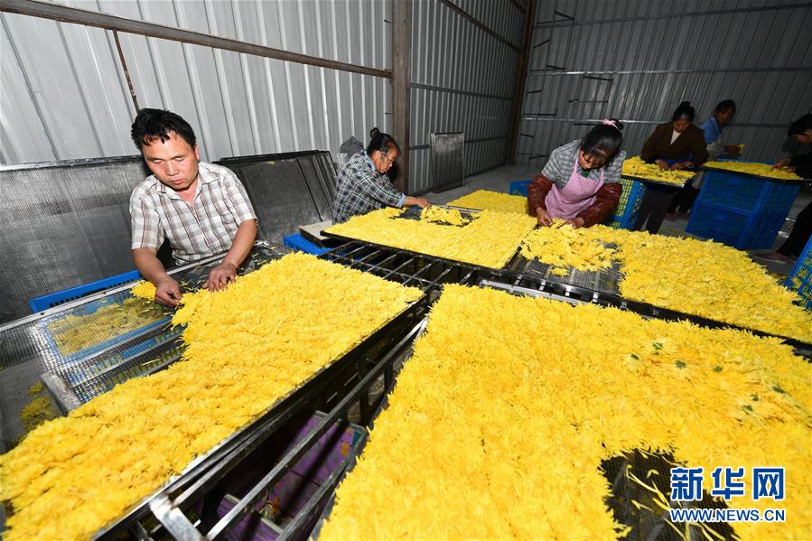 10月27日,金溪村村民将准备烘烤的金丝皇菊摆盘。新华社记者 杨文斌 摄