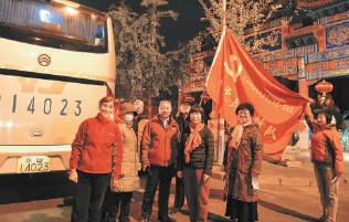 凌晨5点半老党员先锋队的队员们集合出发,队旗是他们每次出发必备。