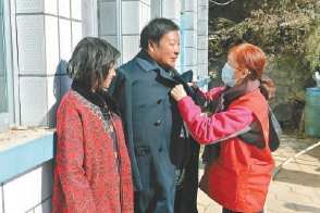 张转玲为贫困户孙占洲夫妻穿上带来的衣物,并送去爱心款。如今,镇里为孙占洲安排了护林员的工作,三个孩子都在胡麻营中心校住校上学,一家人的生活得到很大改善。