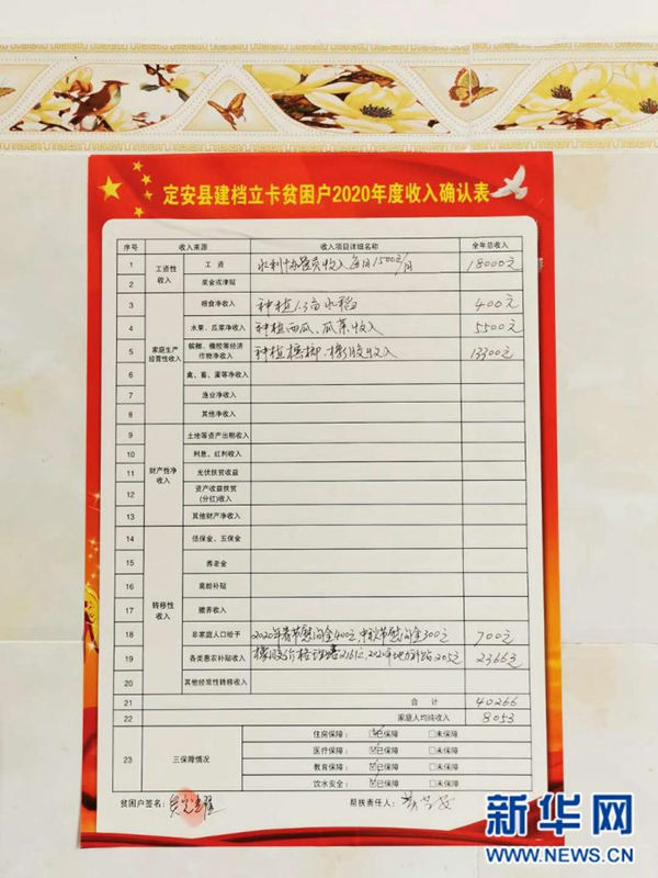 吴定耀家2020年度收入确认表 新华网 唐斓 摄