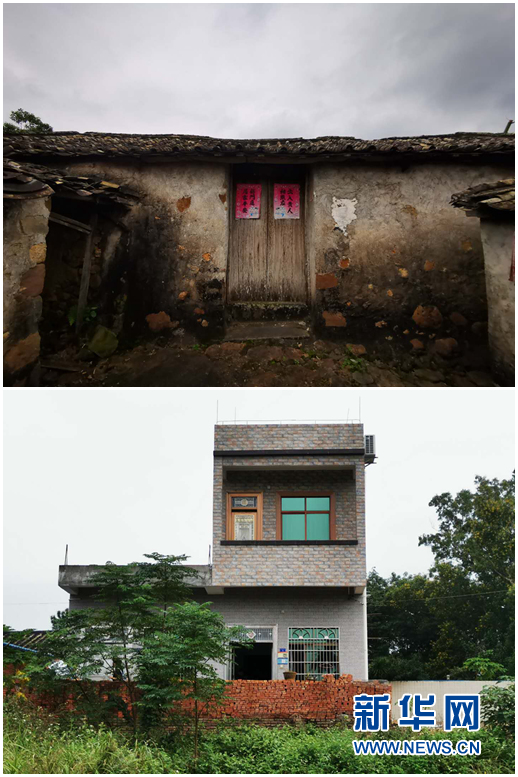 拼版图片:2017年在广铁集团的帮助下,梁昌义一家从旧宅搬进了新盖的二层小楼。上图为梁昌义家旧宅,下图为梁昌义家新房。新华网 唐斓 摄