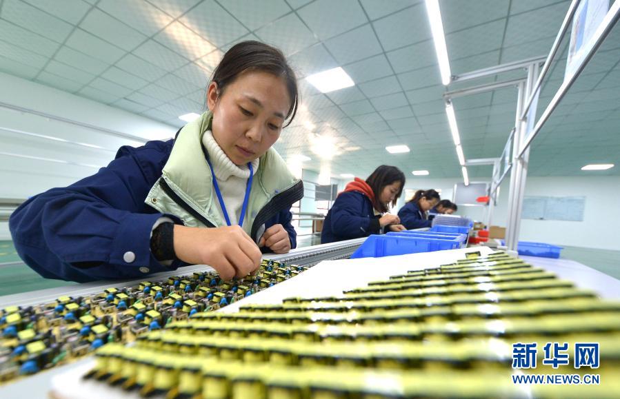 11月11日,工作人员在邯郸市鸡泽县工业园区生产车间内组装电路板。近年来,河北省邯郸市鸡泽县加快新旧动能转换,积极推动电子信息产业发展,助推当地经济高质量发展。目前该县年产4000万件电子产品,企业人均年收入5万元。新华社记者 王晓 摄