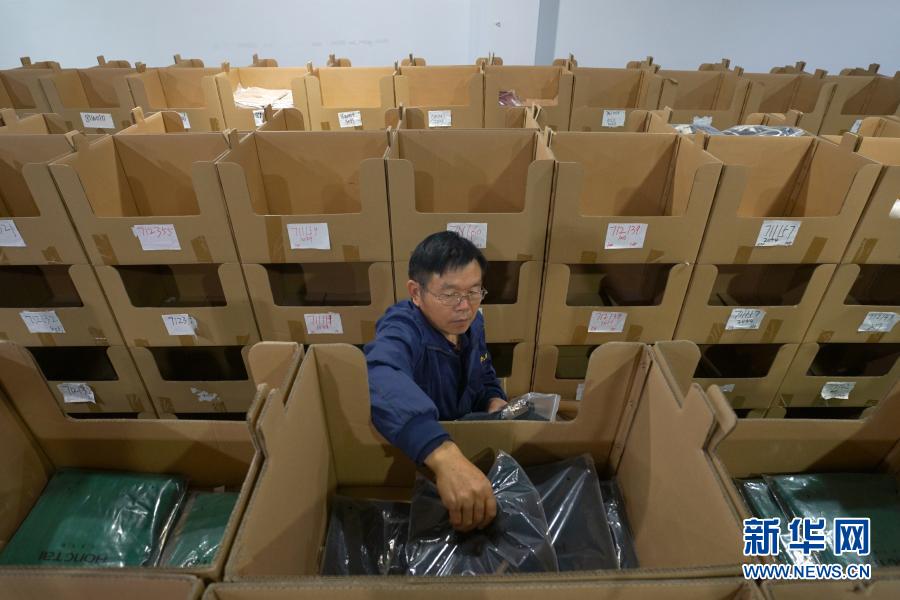 11月11日,清河县一家羊绒制品生产企业的员工在仓库整理羊绒衫。新华社记者 牟宇 摄