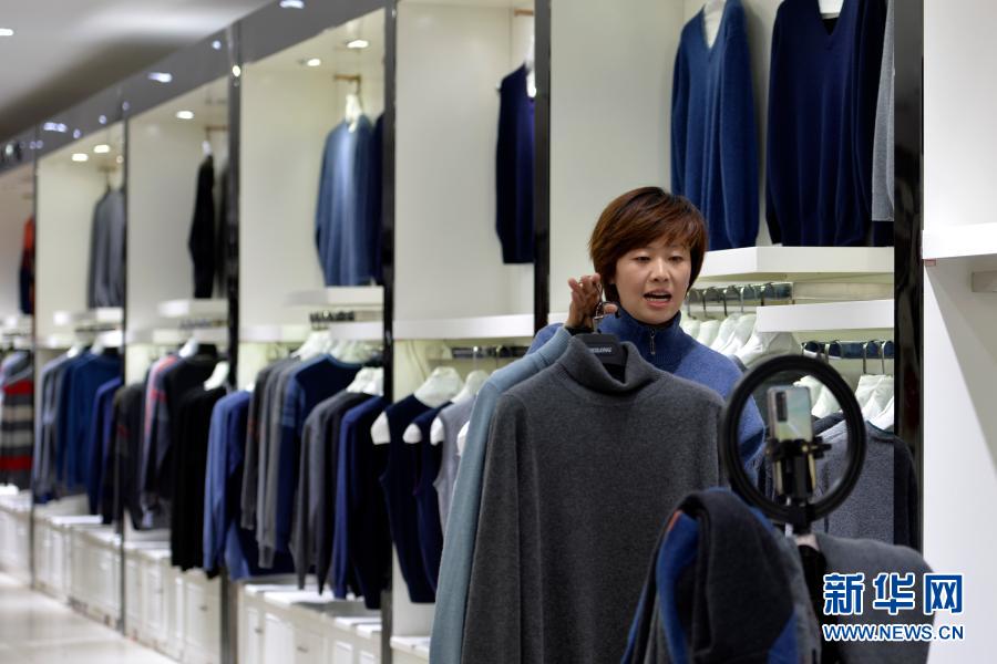 11月11日,清河县一家羊绒制品生产企业的工作人员通过直播推介服装。新华社记者 牟宇 摄