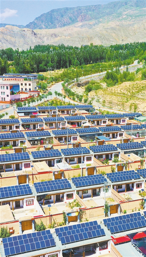 ▲尖扎县德吉村,一排排崭新的院落屋顶上,蓝色光伏板熠熠生辉。为了帮助从大山深处搬出的群众稳定脱贫,华能集团专门在村民屋顶安装了分布式光伏,让农牧民吃上“阳光饭”。