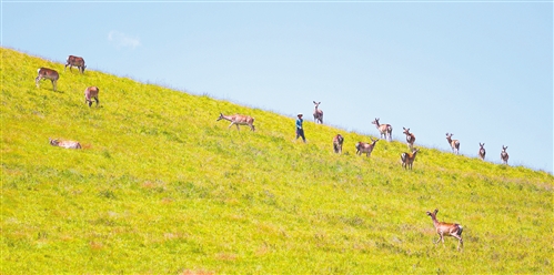 ▼河南县达宗鹿场养殖专业合作社牧民在放牧。该县通过“生态牧场”建设带动农牧民增收,巩固脱贫成果。