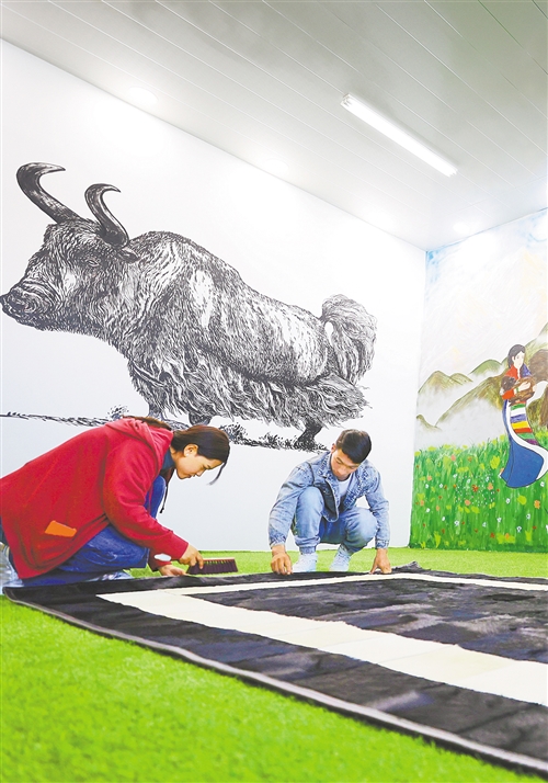 ◀泽库县青藏牧歌农牧科技有限公司员工在整理织好的牦牛地毯,准备销往市场。