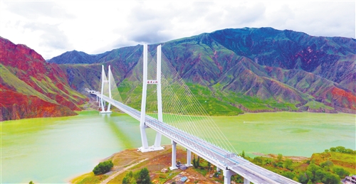 ▼位于海东市化隆县与黄南州尖扎县交界的海黄大桥,矗立于山峦之间。黄南州大力发展枢纽型、网络化、功能性的交通基础设施体系,条条大道、座座桥梁架起群众致富路。