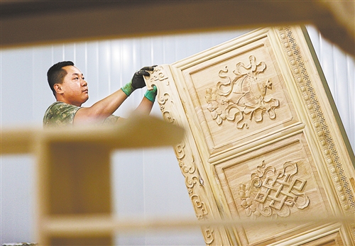 ▼尖扎县多杰创意文化工艺品开发有限公司员工在制作藏式家具。作为省级产业化扶贫龙头企业,该公司围绕“产业+扶贫”的发展模式,安置带动建档立卡贫困户100余人就业。