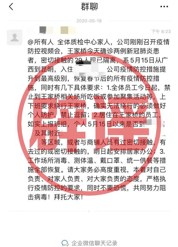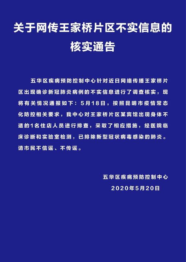 五华区疾病预防控制中心通报称,针对近日网络传播王家桥片区出现确诊新冠肺炎病例的不实信息,该中心进行了调查核实:5月18日,按照昆明市疫情常态化防控相关要求,五华区疾病预防控制中心对王家桥片区某宾馆出现身体不适的1名住店人员进行排查,采取了相应措施,经医院临床诊断和实验室检测,已排除新型冠状病毒感染的肺炎。