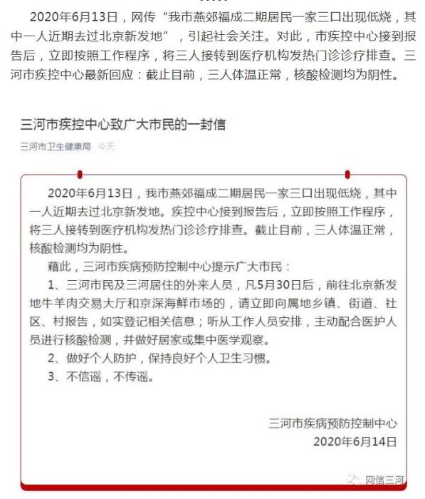 中新网6月14日电 据河北三河市网信办官微消息,近日网络上有消息称三河市一家三口低烧,一人曾去过北京新发地。三河市疾控中心回应称,截止目前,三人体温正常,核酸检测均为阴性。