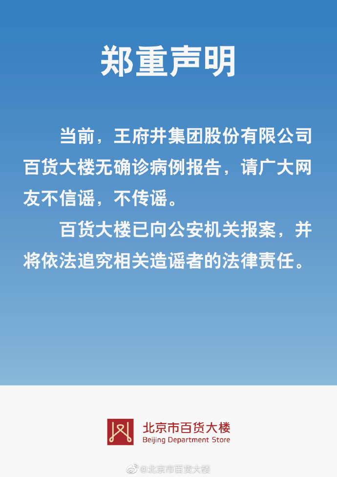 人民网北京6月19日电 针对网传北京市百货大楼出现确诊病例,6月18日百货大楼发布郑重声明:当前,王府井集团股份有限公司百货大楼无确诊病例报告,请广大网友不信谣、不传谣。百货大楼已向公安机关报案,并将依法追究相关造谣者的法律责任。
