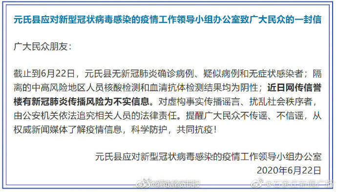 截止到6月22日,元氏县无新冠肺炎确诊病例、疑似病例和无症状感染者;隔离的中高风险地区人员核酸检测和血清抗体检测结果均为阴性;近日网传信誉楼有新冠肺炎传播风险为不实信息。对虚构事实传播谣言、扰乱社会秩序者,由公安机关依法追究相关人员的法律责任。提醒广大民众不传谣、不信谣,从权威新闻媒体了解疫情信息,科学防护,共同抗疫!