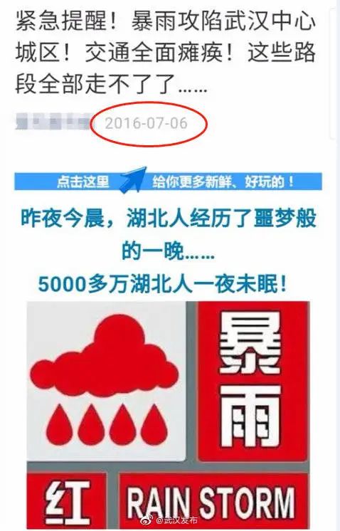 7月6日以来,朋友圈、微信群等多个社交媒体平台上,不少人转发“暴雨攻陷武汉中心城区!交通全面瘫痪”“武汉各地全部淹水!东湖已经正式沦陷!”等信息,其中还配有多种各处渍水的旧图片,甚至被部分自媒体配上最近日期进行发布,误导民众、制造恐怖情绪。