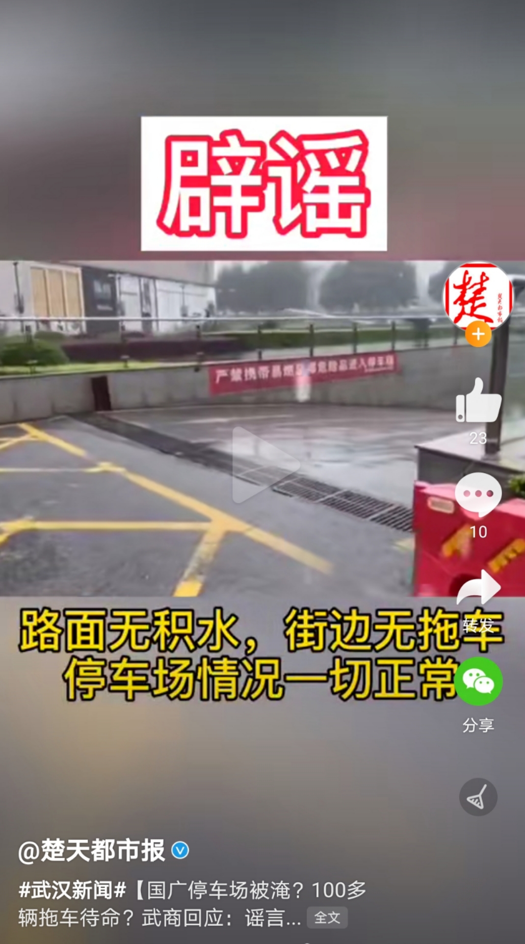 【真相】武商集团方面回应称,视频内容纯属谣言,武商摩尔城地下停车场运行正常,不存在渍水等情况。武商集团方面提醒,暴雨倾城,工作人员都坚守岗位,全力保证商场正常运转,请市民勿信谣勿传谣。