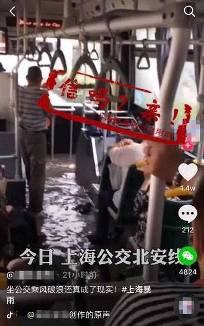 7月6日,某抖音号上发布了一则“上海公交北安线进水,公交当船开”的视频。前两日,在抖音上多段以“瓢盆大泼~泼~盆~瓢”的背景音搭配暴雨照片制作成的视频广泛传播,配文都称是上海暴雨。