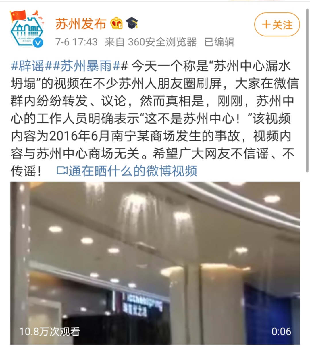 7月6日,一个称是“苏州中心漏水坍塌”的视频在不少苏州人朋友圈刷屏,大家在微信群内纷纷转发、议论。