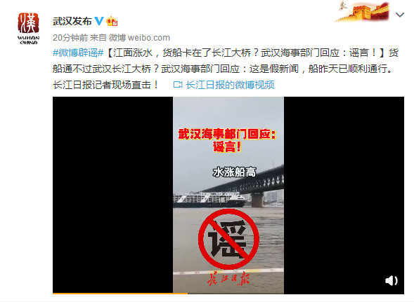 【真相】近日,网传“武汉江面涨水,货船卡在了长江大桥”,并配以视频。7月12日,武汉海事部门回应,此传闻不实,船已顺利通行。