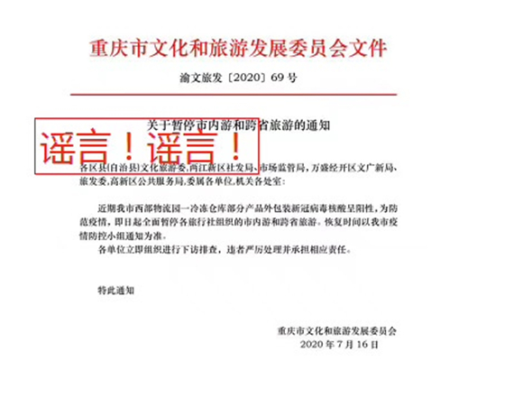 网络上流传的通知显示,“重庆因西部物流园区一冷冻仓库部分产品外包装新冠病毒核酸呈阳性,为防范疫情,即日起全面暂定旅行社组织的市内游和跨省旅游,恢复时间以我市疫情防控领导小组通知为准。”经重庆市文化和旅游发展委员会查实,该通知系伪造文件。