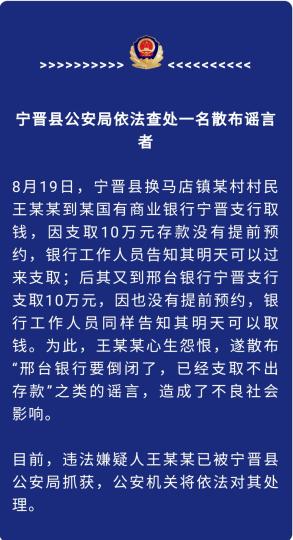通报称,19日,宁晋县换马店镇某村村民王某某到某国有商业银行宁晋支行取钱,因支取10万元存款没有提前预约,银行工作人员告知其明天可以过来支取;后其又到邢台银行宁晋支行支取10万元,因也没有提前预约,银行工作人员同样告知其明天可以取钱。为此,王某某心生怨恨,遂散布“邢台银行要倒闭了,已经支取不出存款”之类的谣言,谣言在当地造成了不良社会影响。