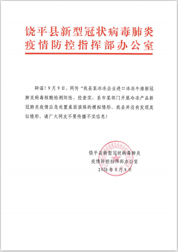 9日,一张有“饶平海关通报某批号进口冷冻牛排新冠病毒核酸检测阳性,且已销售”等文字的图片在当地流传,引发恐慌。对此,饶平县疫情防控指挥部辟谣称,网传图片来自于潮州市某部门开展冷冻产品新冠肺炎疫情应急处置桌面演练的模拟情形,广大网民勿需恐慌。