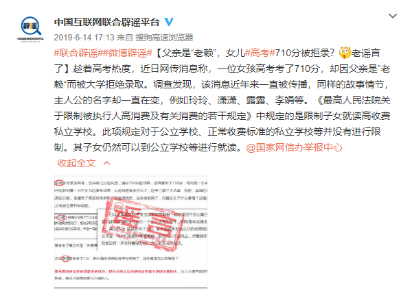 经搜索发现,关于失信被执行人与子女教育的不实消息不在少数,其中“老赖子女高考710分被拒录”“老赖子女被强制退学”等信息传播较广。事实上,此类消息近年来一直被传播,同样的故事情节,仅仅更换了老赖子女的名字,内容如出一辙,套路依旧。