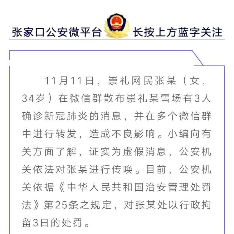 11月12日,张家口市公安局发布通告,11月11日,崇礼网民张某(女,34岁)在微信群散布崇礼某雪场有3人确诊新冠肺炎的消息,并在多个微信群中进行转发,造成不良影响。经证实为虚假消息,公安机关依法对张某进行传唤。
