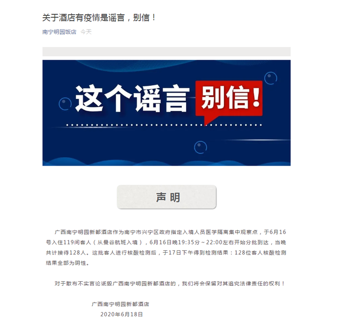 广西南宁明园新都酒店发布声明,对6月16日晚,一则“南宁明园新都酒店前段时间接待北京来的人,有20几人发烧,被集体隔离”的传言进行辟谣。