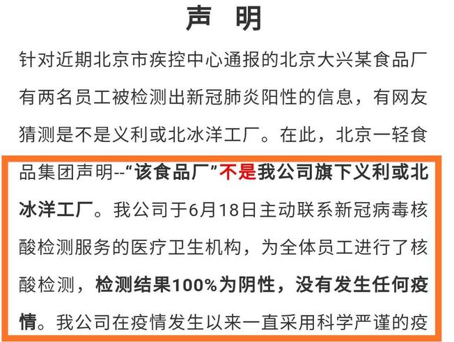 近期北京市疾控中心通报的北京大兴某食品厂有两名员工被检测出新冠肺炎阳性的信息,有网友猜测是不是义利或北冰洋工厂。6月21日,北京一轻食品集团有限公司声明:公司为全体员工进行核酸检测,检测结果100%为阴性,没有发生任何疫情。