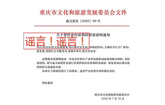 近日,网络上流传落款时间为2020年7月16日重庆市文化和旅游发展委员会印发的《关于暂停市内旅游和跨省旅游的通知》,刚刚重庆市文化和旅游发展委员发布声明,该文件系伪造,已向公安机关报案。