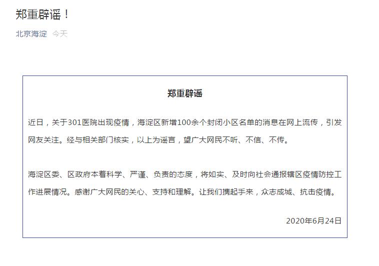 近日,关于301医院出现疫情,海淀区新增100余个封闭小区名单的消息在网上流传,引发众网友关注。经与相关部门核实,以上为谣言,望广大网民不听、不信、不传。