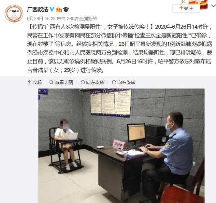 通报称,截止目前,昭平县无确诊病例和疑似病例。6月26日16时许,昭平警方依法对散布谣言者陆某(女,29岁)进行传唤。