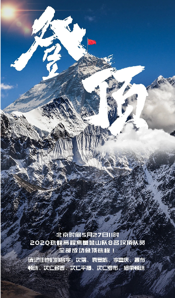 北京时间5月27日11时整,2020珠峰高程测量登山队8名攻顶队员,全部成功登顶珠峰!