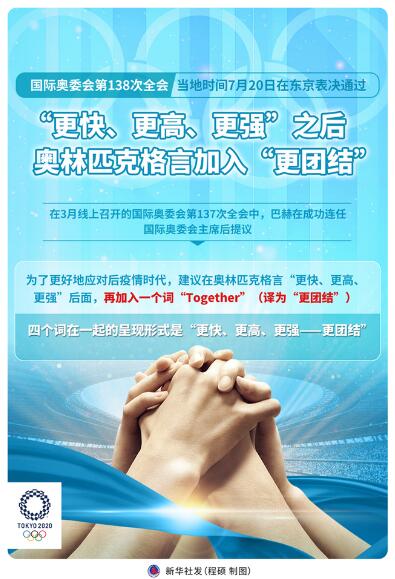 不久前,国际奥委会第138次全会破天荒地表决通过,在奥林匹克格言“更快、更高、更强”之后加入“更团结”。这也体现了奥林匹克大家庭战胜疫情、共克时艰的决心和勇气。