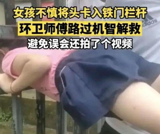 8月20日下午,安徽省淮南市凤台县凤凰湖新区,一名女童不慎头部卡入小区铁门空隙中,进退不得。路过的市民高先生询问情况后,让旁边一名女童拿手机拍摄记录,自己上前帮助女童从铁门中成功脱困。