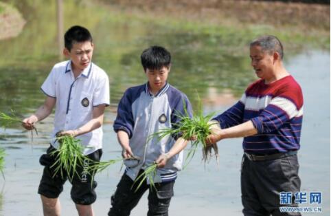 四川省华蓥市马架坪村,农民在田间给中学生讲解插秧方法。新华社发 邱海鹰 摄