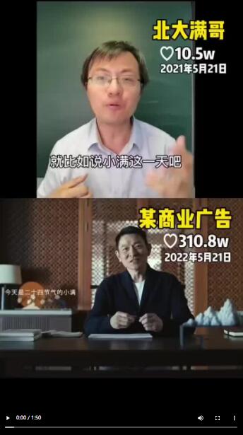 5月22日,奥迪“小满”广告抄袭一事在社交媒体上刷屏。网友“北大满哥”称:奥迪一则关于小满节气的广告,涉嫌抄袭他在2021年5月21日一条视频的文案。对此,奥迪发声明称“表示诚挚歉意”。随后,该广告的视频开发团队称,因团队版权意识薄弱,在未与版权方沟通的情祝下,直接使用了网友“北大满哥”关于“小满”视频中的文案内容,对此“深表歉意,诚恳地向原作者道歉”。