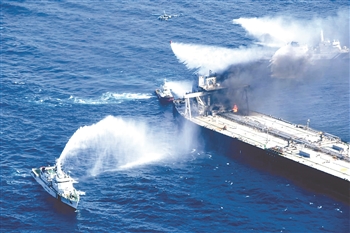据斯里兰卡和印度方面的通报,尽管大火烧毁了油轮的上层结构,但油轮防火设计仍在发挥阻隔作用,这使得满载着27万吨未提炼原油与1700吨柴油的储油船舱还没有着火。